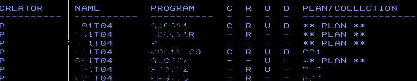 The solution is to use SYSTABAUTH table. Assume the table name is ‘DB1T04’ and we want to find out what all programs performs C(CREATE) R(READ) U(UPDATE) or D(DELETE) operation. A simple query to fetch the matrix would like below: