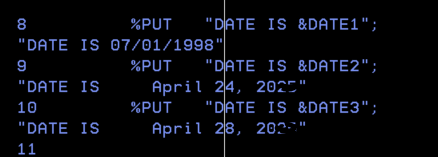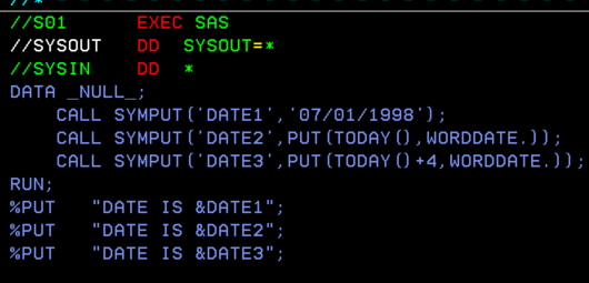 To start with, will see how to set dates using SYMPUT. The output will be displayed in SASLOG in spool. Anyway the variables, (&DATE1/2/3) can be used in the code diligently as and when needed. Even it can be used to override the current date in SAS in header and FOOTER