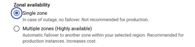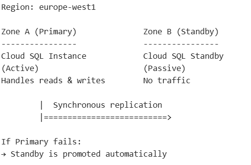Cloud SQL is the fully managed relational database service on Google Cloud. It supports standard database engines including MySQL, PostgreSQL and SQL Server, making it an ideal lift-and-shift target for teams migrating from on-premises or local databases. It supports vertical scaling by increase CPU, memory, or storage resources to handle heavier workloads. For higher availability and durability, it offers automatic replication across zones within a region. The following options helps us to configure the same.