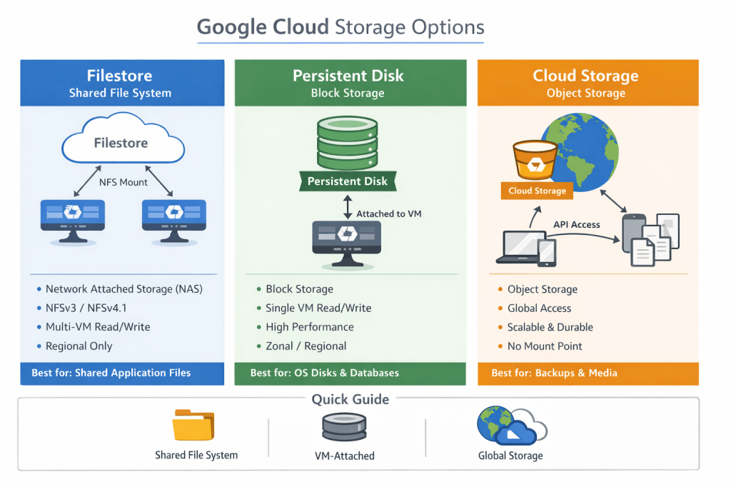 | Object Storage | Google Cloud Storage | Backups, archives, media, big data |